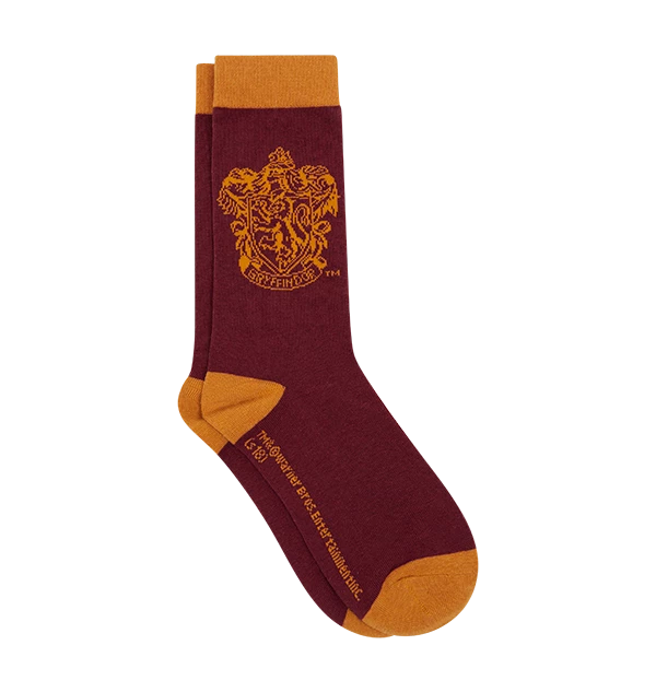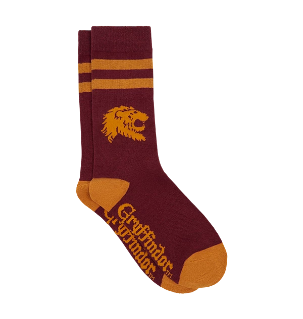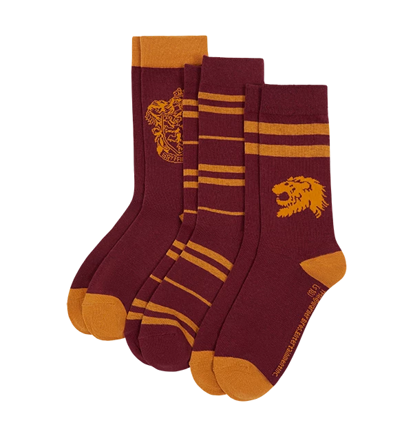 The 3-pack socks feature unique designs, including thin and thick striped patterns, the iconic Gryffindor house crest, and the text ‘Gryffindor’ on the bottom of the sock. Celebrate your house pride with these one size fits all socks, perfect for everyday wear. Not a Gryffindor? The socks are also available in other Hogwarts house designs.