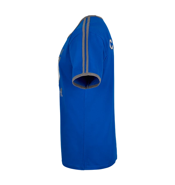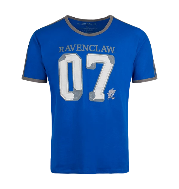 A comfy adult athletic T-shirt in striking Ravenclaw blue with white and grey applique of number 07 on the front and the name “Chang” on the back. Features “Ravenclaw” in grey screen print and grey embroidered house icon on front. Double-stitched grey fabric stripes down the sleeve, and edging around hem of neck and sleeve, give a finished look. Embroidered, screen-printed and appliqued features.