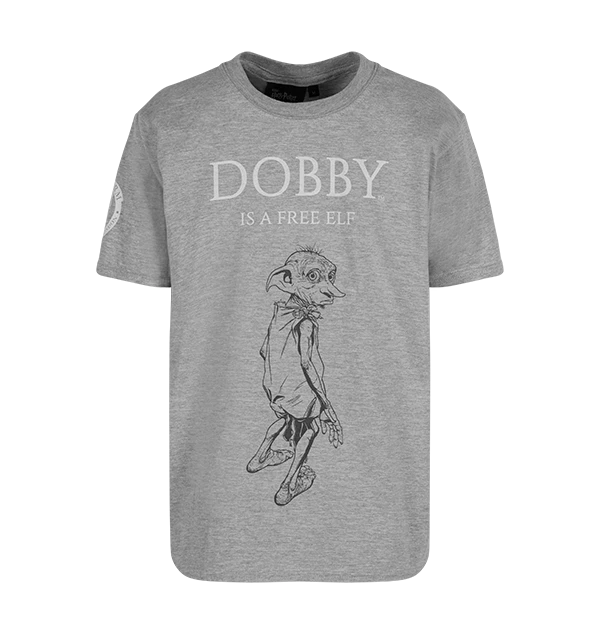A grey kids t-shirt featuring Dobby and the Platform 9 3/4 logo on the arm.