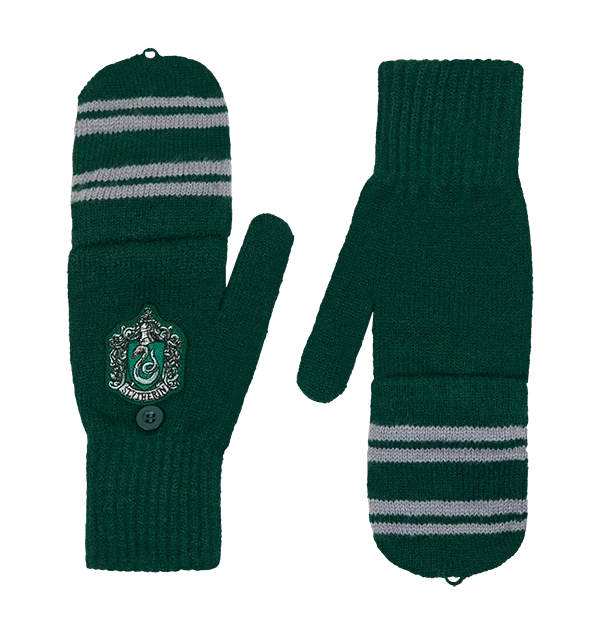 Keep warm and cosy on trips between Hogwarts and Hogsmeade with these Slytherin Mitten Capped Gloves. The gloves come in an emerald green design and have grey stripes across the centre, the traditional house colours of Slytherin.