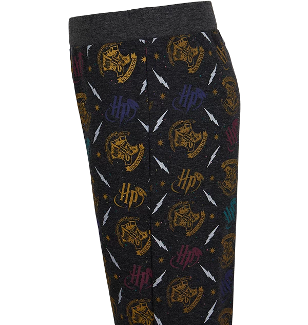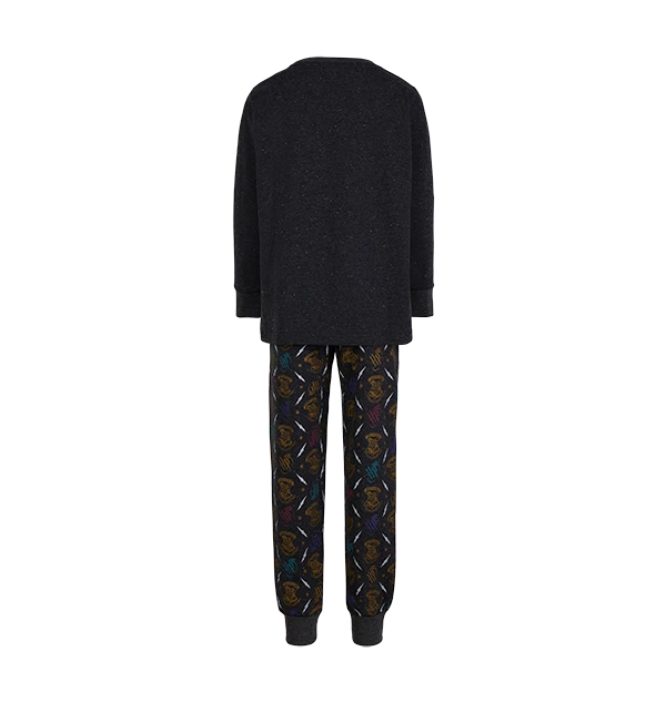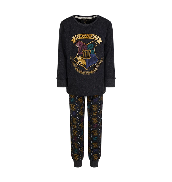 A grey long-sleeve top with a metallic-gold Hogwarts crest pairs with cosy dark grey bottoms featuring an all-over printed pattern. An elasticated waistband is included for ultimate snugness.