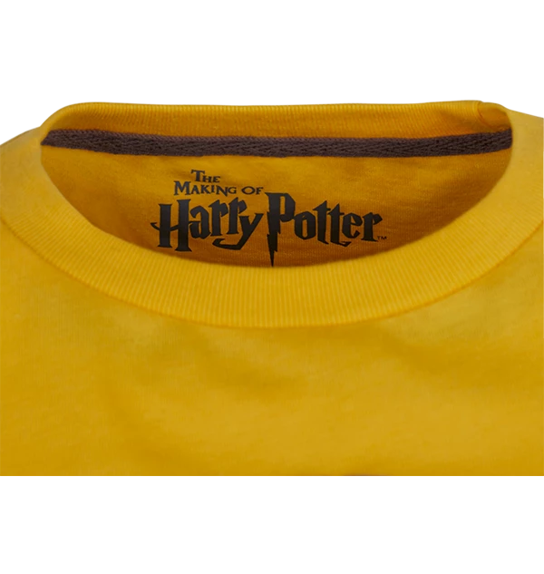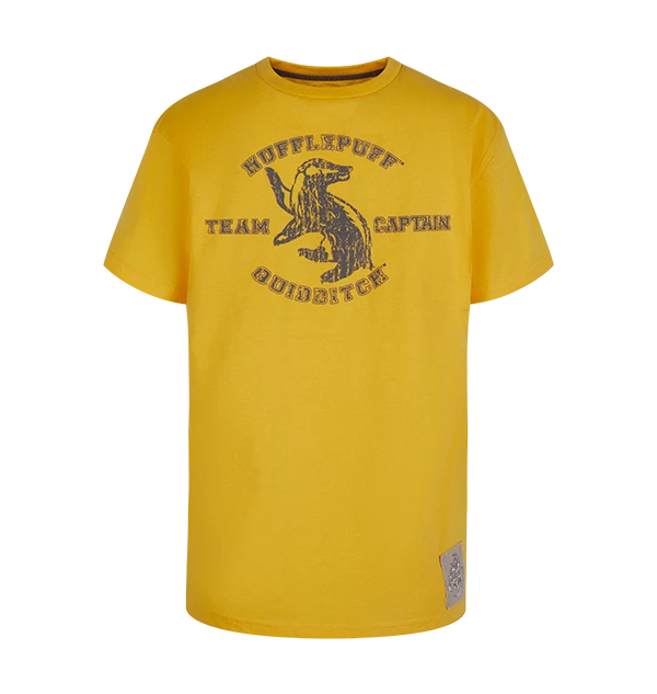Join the Hufflepuff Quidditch team with this Kids Hufflepuff Quidditch Team Captain t-shirt. The t-shirt is a bright yellow colour, the traditional colour of the Hufflepuff house, and features a raised flock print design across the chest in grey of the Hufflepuff house animal, a badger.