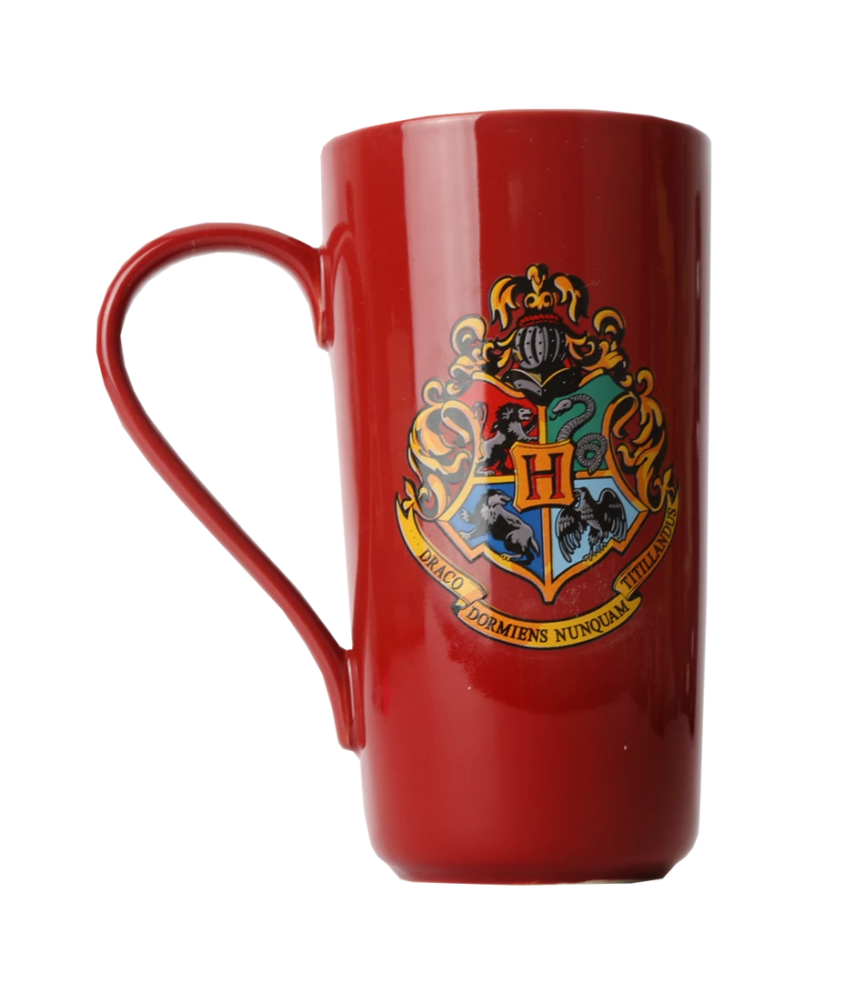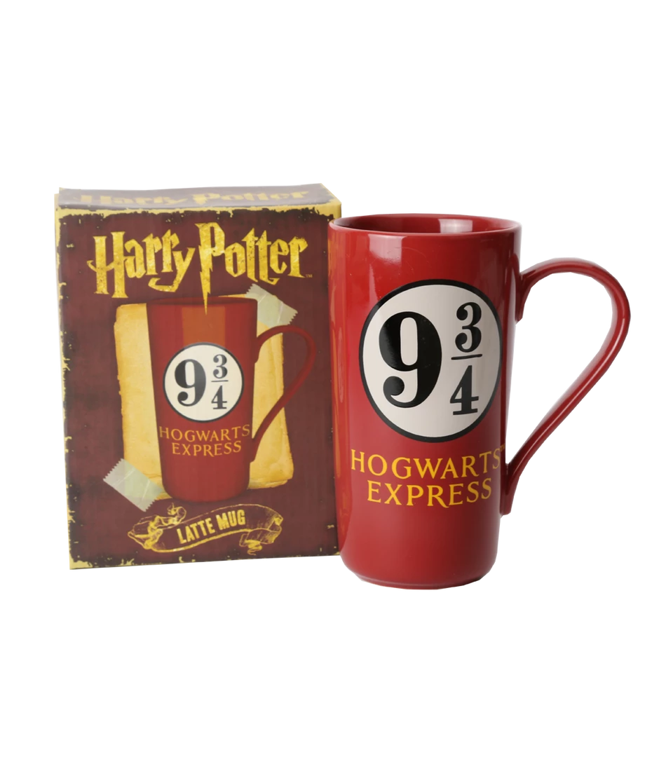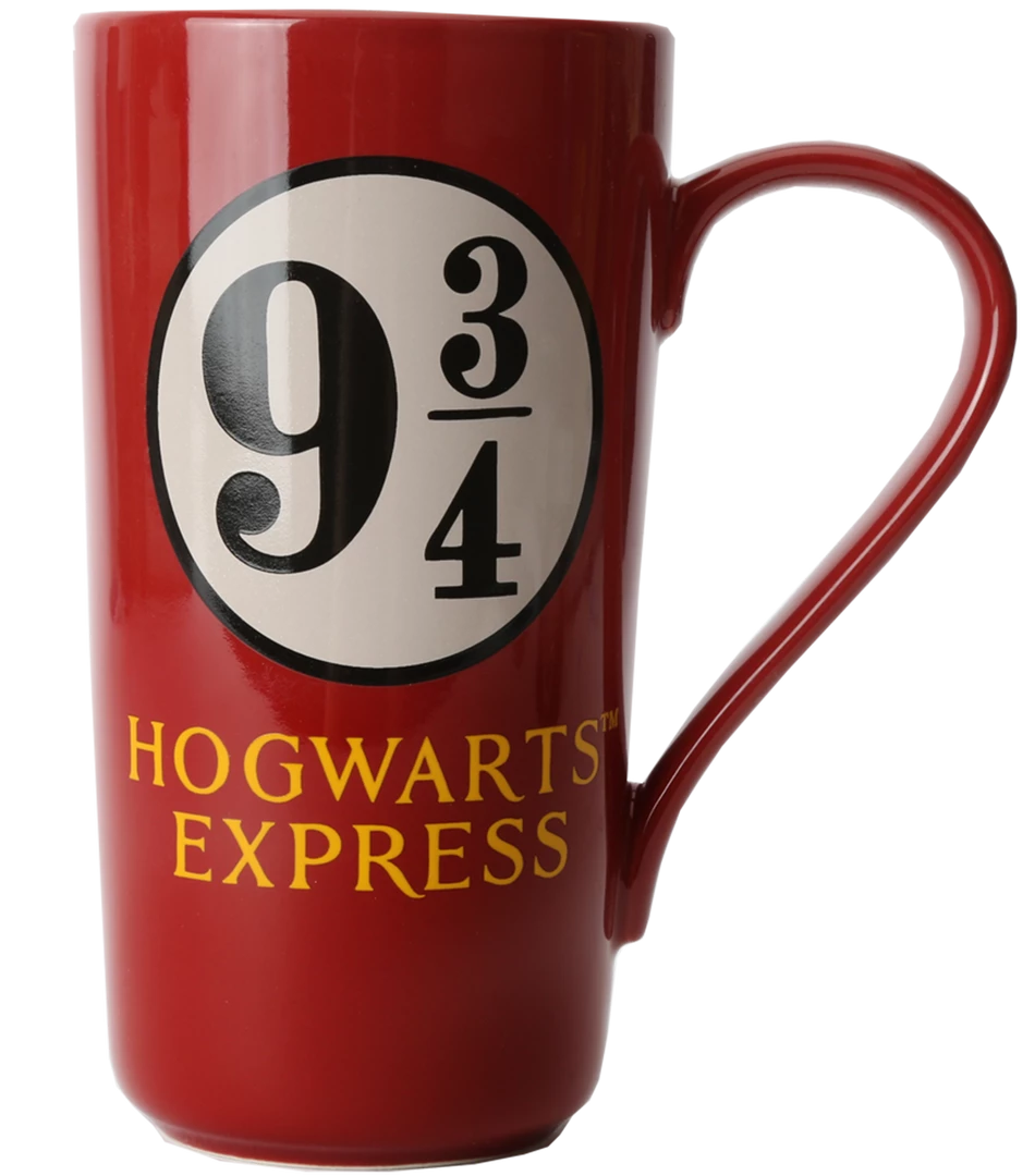 A red latte mug featuring the Platform 9 3/4 and Hogwarts Express logos.