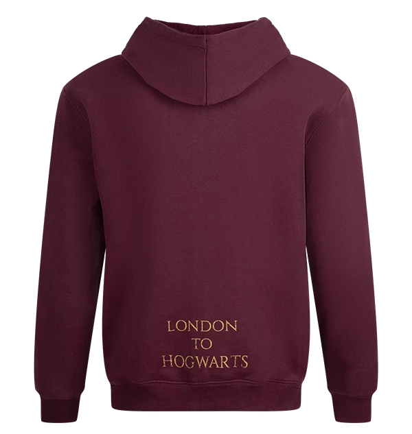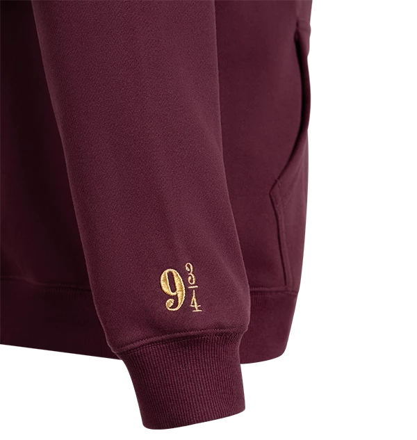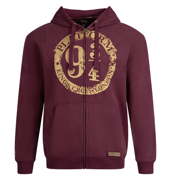 Wizardry school pride is made easy with this statement zipped hooded jumper. This unisex, burgundy Platform 9¾ Hoodie features a bespoke gold design of the Platform 9¾ logo in a unique distressed print. It includes front pockets to hide away your trinkets, or just to keep hands warm in the cooler months. This Platform 9¾ hoodie has a fitted hood and two burgundy strings which are adjustable for a suitable and comfortable fit. The perfect addition for any wizard or witch’s wardrobe.