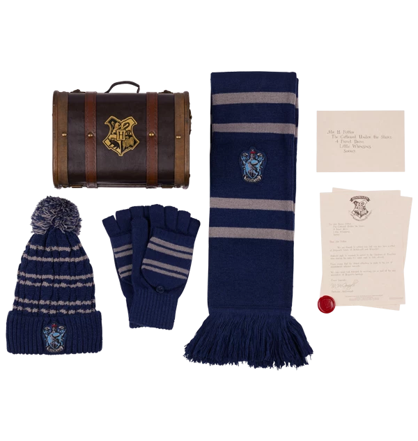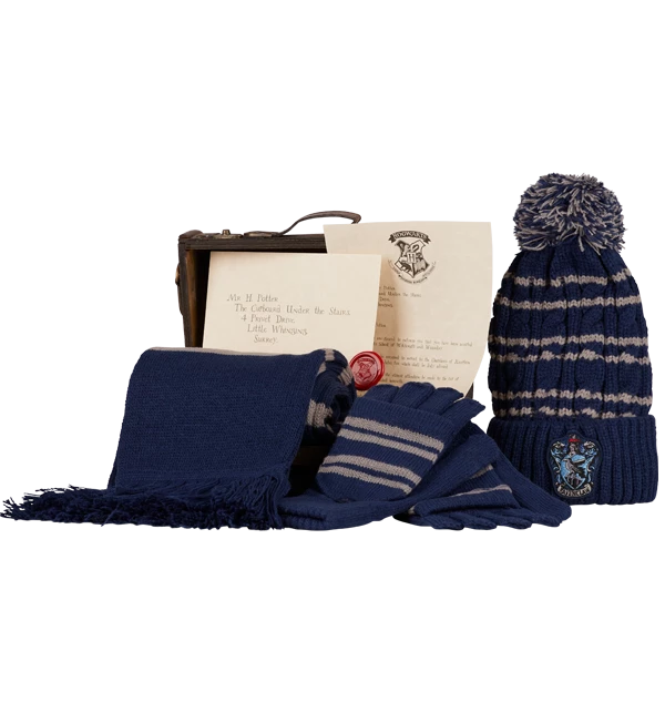 Take home this mini version of the Hogwarts School Trunk, crafted to resemble those used by Hogwarts students travelling on the Hogwarts Express. This bespoke Ravenclaw gift trunk features some exclusive items from our knitwear collection, as well as a Hogwarts Acceptance Letter, personalised with your own name and complete with an exclusive supplies list.