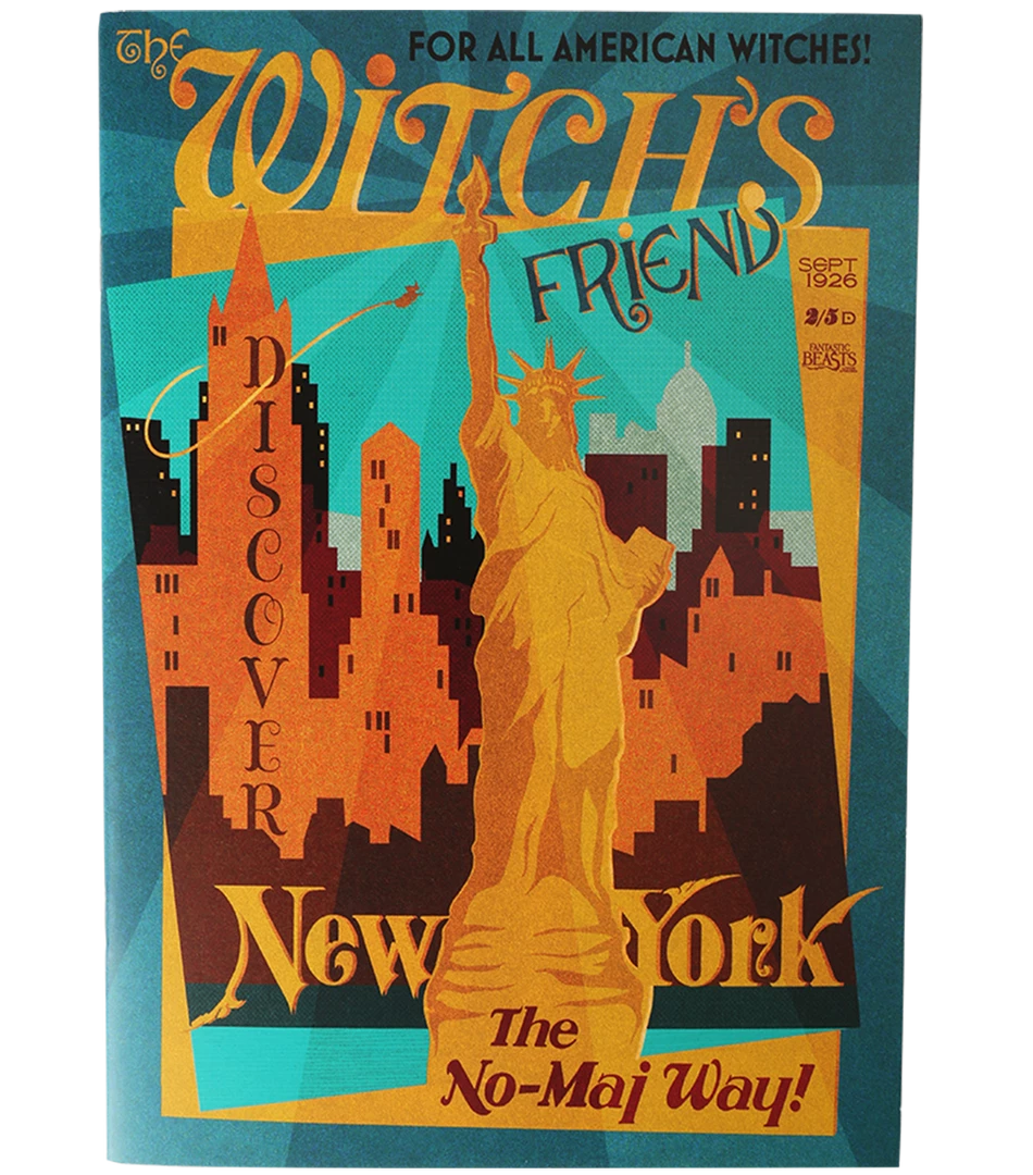 An A5 paper notebook with the front cover in the style of the ‘Witch’s Friend’ magazine in from Fantastic Beasts and Where to Find Them. The inside pages are lined, with the Fantastic Beasts logo present in each top-hand corner.